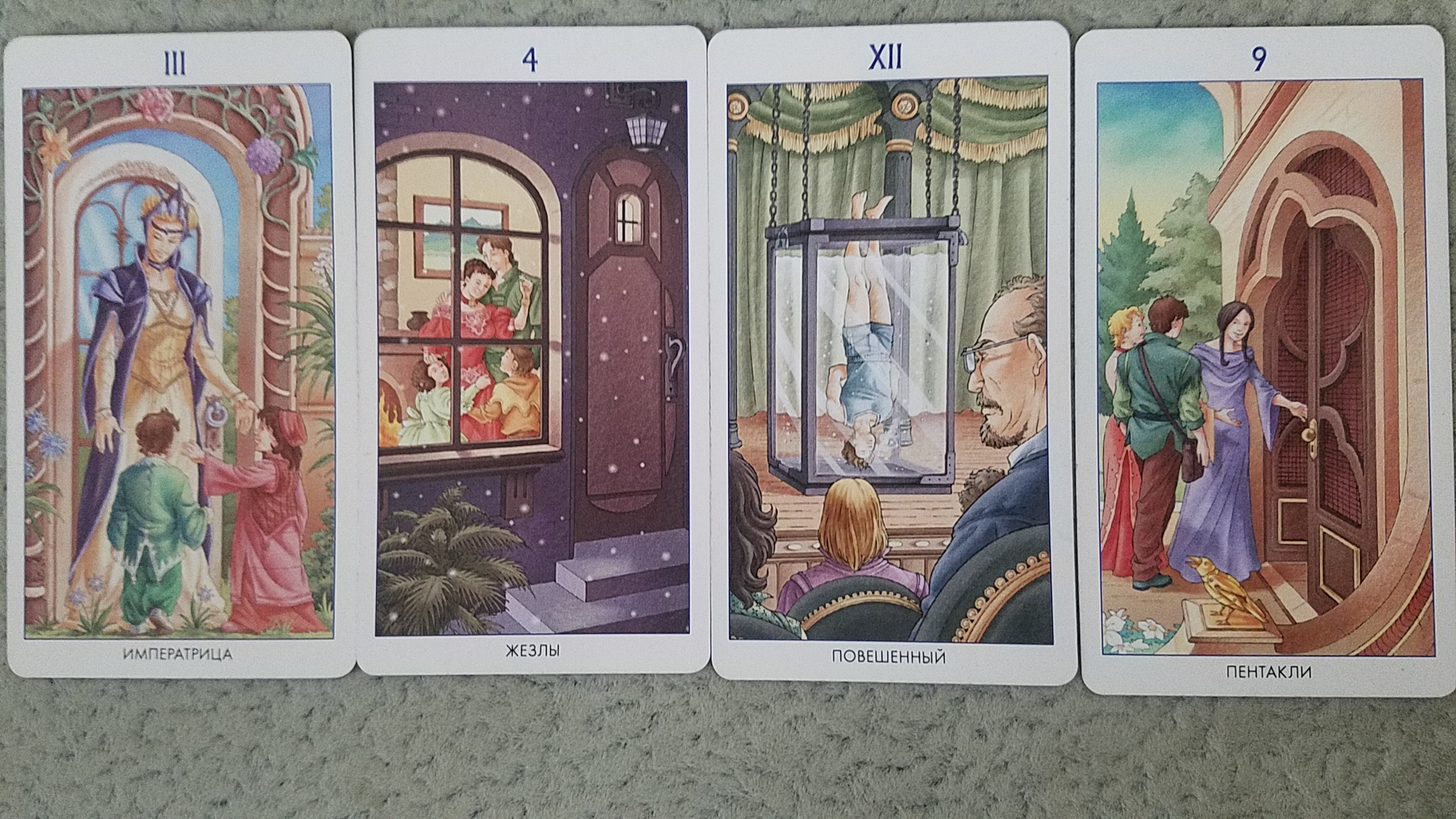 Действительно, была будто в полутрансе- 4 кубков+королева. Думаю, наблюдали за моими действиями, пока нет никакого мнения -Шут+туз. И все же, решили присмотреться ко мне - Императрица(доп. 7 пентаклей), ибо тетя с потенциалом на перспективу.