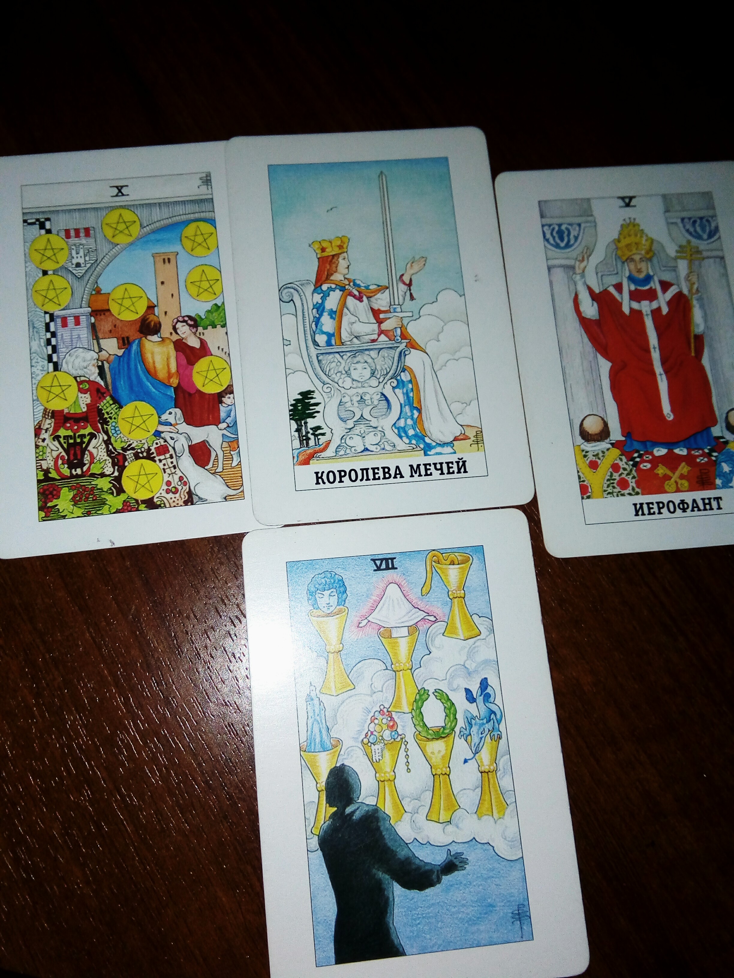 Жрица(доп. 10 пентаклей) - 10 жезлов(доп. 4 мечей) - король кубков(доп. королева жезлов).