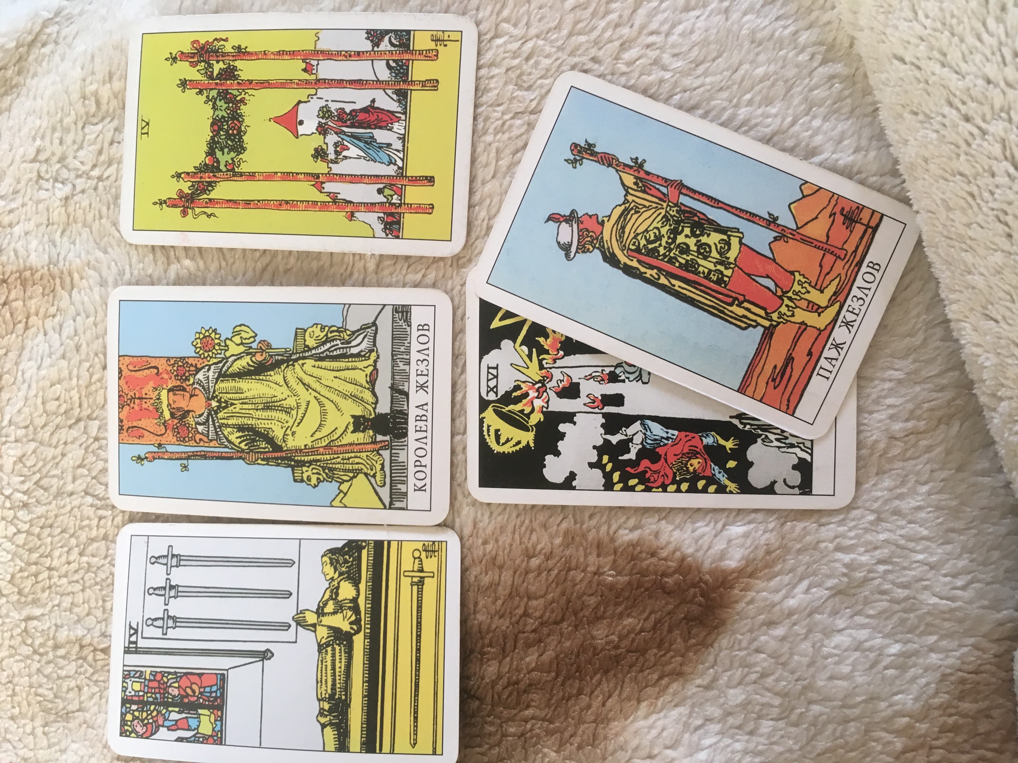 4 мечей, королева Жезлов, 4 жезлов. Итог - Башня и доп.Паж жезлов
