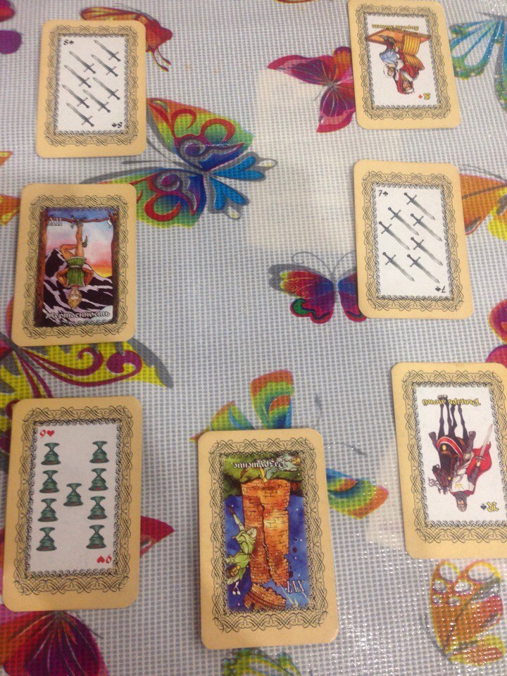 король кубков - пятерка мечей (доп. Повешенный) - семерка жезлов (доп. пятерка пентаклей). Дно - Солнце.