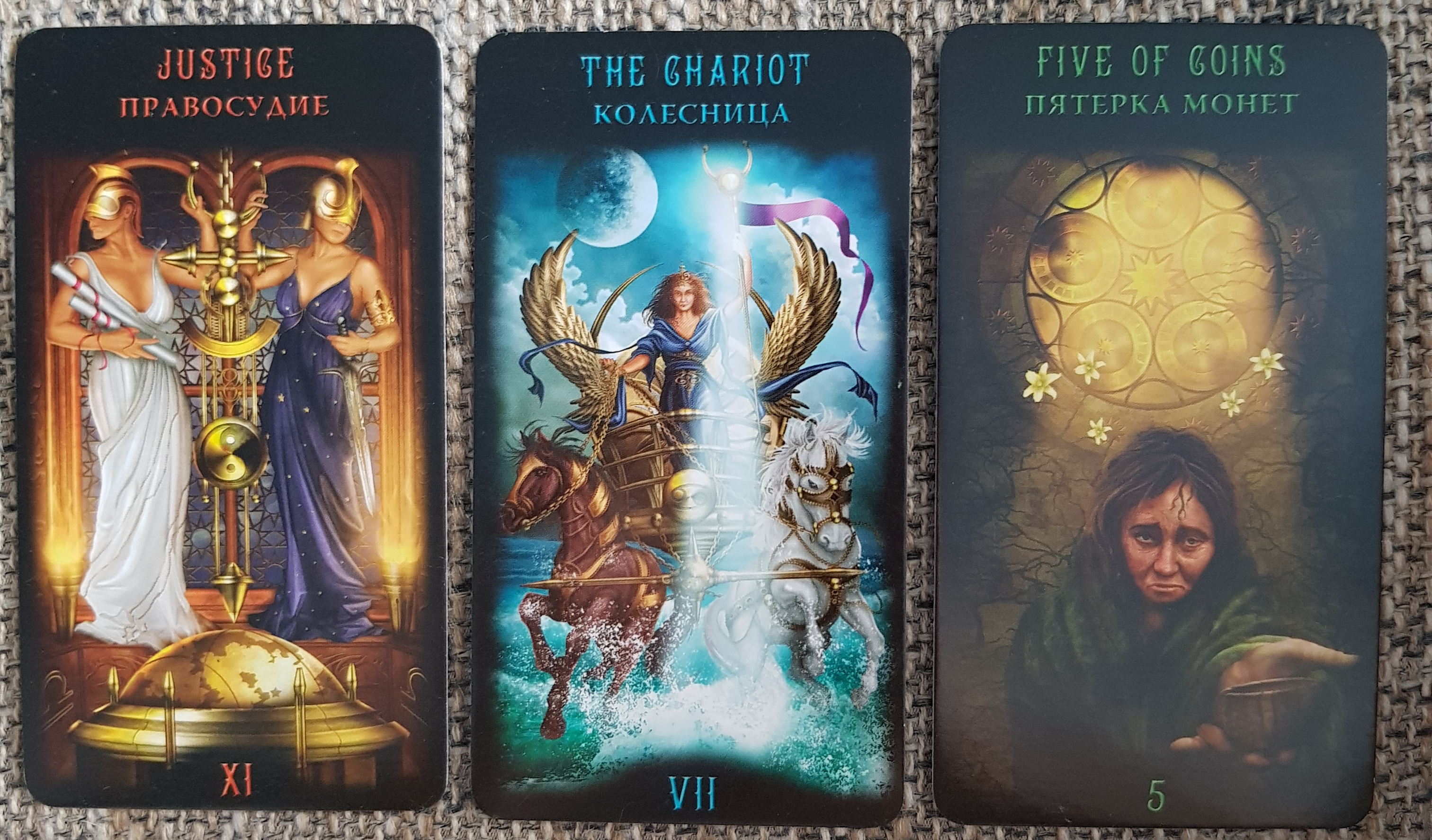 Правосудие, Колесница, Пятерка монет. Квинт - Вера (Иерофант).