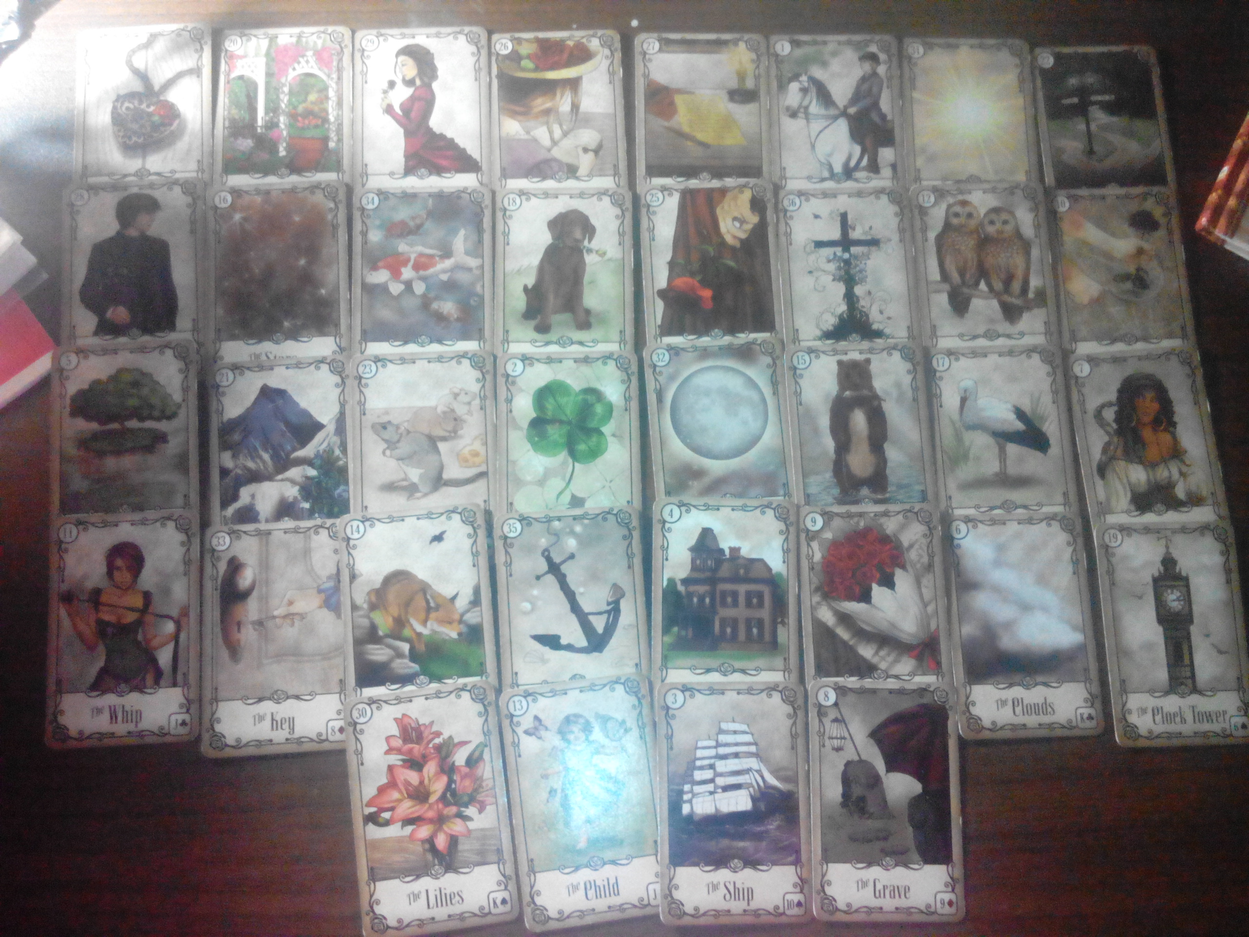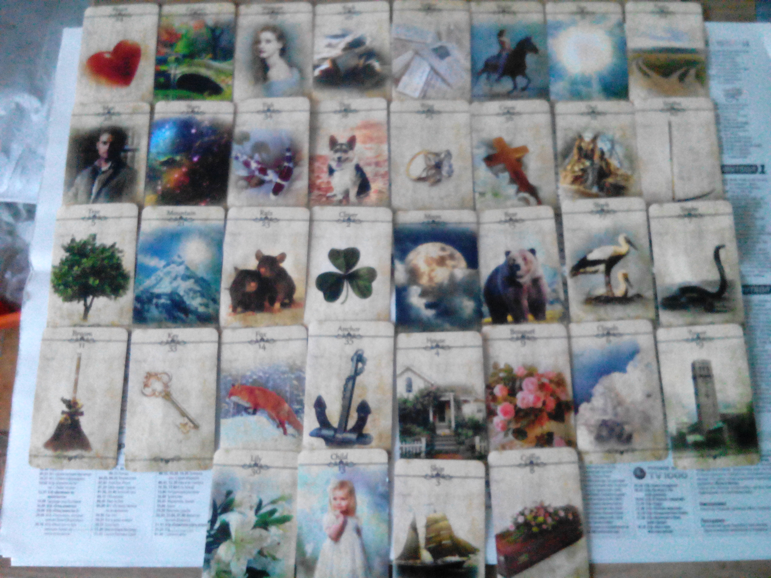 Под змеею, коса, гора, якорь,... тут мне коса не нравится, это либо скандал, либо что то серьезное: перелом... от косы карты аисты, как перелет, вниз сад тучи. В тучах луна, развилка, сами тучи в лилиях, звезды. Как перелет и отдаление. Такое еще может показывать, что бабушка чудит с возрастом и типа немного сильнее начнет. Будущее змеи: метла, луна, совы, кольцо в гробу. Затем сама карта змеи переписывается в будущее- гроб в доме женщины. После гроба тучи, вниз сердце в кресте, а вверх: письмо книга кольцо.