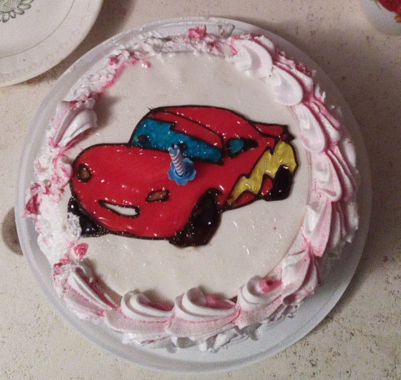 Мне кажется, есть цветочки, красивые, красно-белые вперемешку с ягодками типа черешни или вишни кое-где, а в центре небольшая съедобная фигурка, сначала показалась дата (или просто надпись), но больше склонна думать, что там фигурка какой-то живности, может даже человека, съедобная.