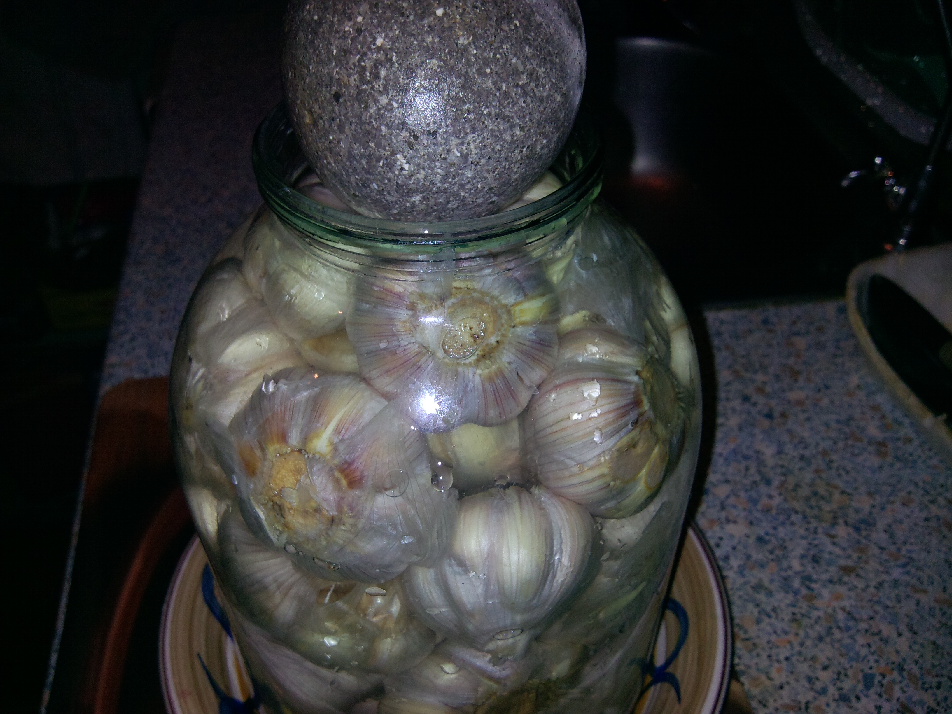 Чеснок вымыть , снять верхнюю кожуру , но так ,чтобы не распались зубчики , и уложить в 3-х литровую банку , залить обычной фильтрованной водой , сверху положить пресс и дать день вымокнуть . Сливаем эту воду , потом наливаем чистой , она , как мерка для нас , пол банки воды вылить , в мерку и узнать сколько вылили ? , а вторую половину в кастрюльку и добавляем столько же яблочного сока! (беру обычный магазинный без мякоти) и 3 стол , ложки каменной соли . Не варим , заливаем чеснок , закрываем крышкой и на 2 недели на болкон . Через 2 недели пробуем -если готов , в холодильник ,а если холодно можно на балконе оставить и приступать к вкуснятине )
